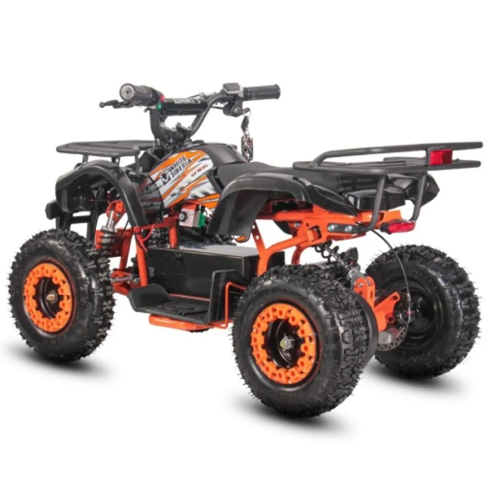 Запаса заряда АКБ хвати на преодоление 25 км пути без подзарядки. Фирменные амортизаторы обеспечивают плавную езду по любому типу дорожного рельефа. Электроквадроцикл оснащен большой светодиодной фарой, разрешающей езду и развлечение подрастающего водителя в вечернее время и непогоду.