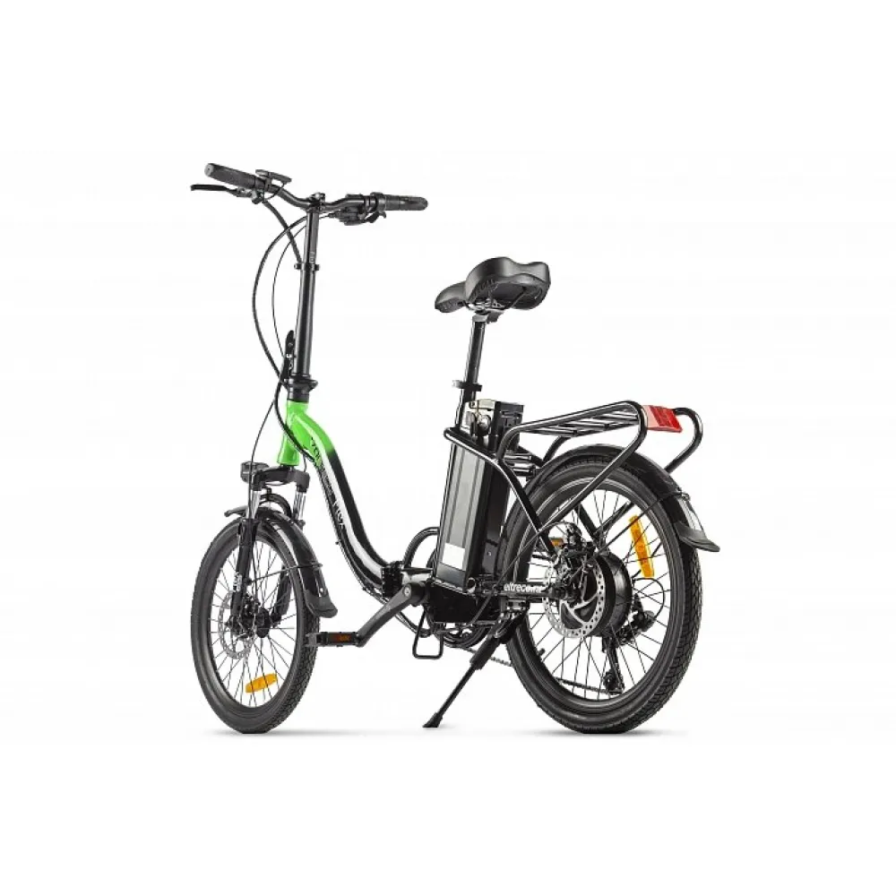 Велогибрид VOLTECO FLEX – складной вариант электровелосипеда для которого всегда найдется место в доме. Легкий по весу транспорт предназначен для езды по городской и загородной местности. Велик легко управляется, прост в обслуживании. Имеет длительный срок службы, не ломается благодаря оригинальной технической новинки. На этапе изготовления производитель позаботился о защите электровелосипеда, удобстве и безопасности ездока.  Предлагаемая нашим магазином модель в черно-зеленых цветовых оттенках выглядит стильно и современно. Из технических преимуществ стоит отметить следующие: